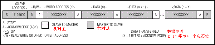 读操作:按RAM指定的首地址依次读取N个字节数据,主器件首先传送从器件地址。从器件返回一个应答位。随后是从器件传输的一系列数据字节。主器件收到除最后一个字节外的所有字节后返回一个应答位。在收到最后一个字节后,返回一个“非应答位”NACK。其格式下图所示。