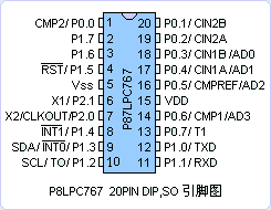 P87LPC767基于80C51内核技术设计制造,属于加速80C51指令周期带4路8位A/D转换器的OTP单片机,指令周期比80C51快两倍,在20MHz的时钟频率下,除乘法和除法指令外,指令周期仅为300-600ns。该单片机具有20个引脚,它属于低价位,小管脚、多功能的单片机。它可提供一种可编程选择高或低速石英晶体振荡或RC振荡的方式,较宽的工作电压范围(2.7-6.0V),可编程端口输出配置,可选择斯密特(Schmitt)触发输入,准双向口,开漏输出,上拉或只允许输入等功能。20mA的LED驱动输出,同时,口线的转换速度亦可控,必要时可降低口线的转换速率,以降低EMI(电磁辐射干扰)。